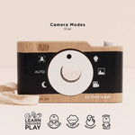 Capture the magic of imagination with this retro-style wooden camera toy, designed with high attention to detail. It features a rotating kaleidoscope lens and realistic camera modes on the back to switch between. Press the push shutter button for added fun and carry it easily with the cotton wrist strap. Crafted from FSC®-certified wood, this eco-friendly toy is perfect for little photographers looking to explore and create.