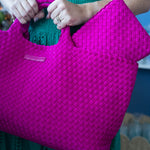 Looking for a bag that holds as much potential as your dreams? The large Woven Mahjong Carryall has it all. Featuring a convenient, removable matching pouch for your tiles, this dreamy bag is spacious enough to keep you organized, on trend and ready for the next game. Designed to carry all your mahjong necessities, it holds your tiles, racks, mat and cards. Made from durable woven neoprene this bag is easy to clean and comes with a detachable crossbody strap. Choices: Lavender, Chartreuse (tile bag interior is hot pink), Fawn, Navy, Cream & Teal * Material: Neoprene * Exterior Details: Woven * Interior Details: Open Compartment, Matching Zipper Tile Pouch, Crossbody Strap * Carryall Dimensions: 25.6" L x 6" W x 11.8" H * Tile Pouch: 15.5" L x 7" H