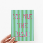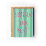 Send someone a bright and colorful compliment with this beautiful 5x7 card, featuring the words "You're the Best!" in light pink on a beautiful striped background. The card is blank inside for your own personal message, and comes with a brown kraft envelope. Perfect for thank yous, appreciation, just because, thinking of you, and more!